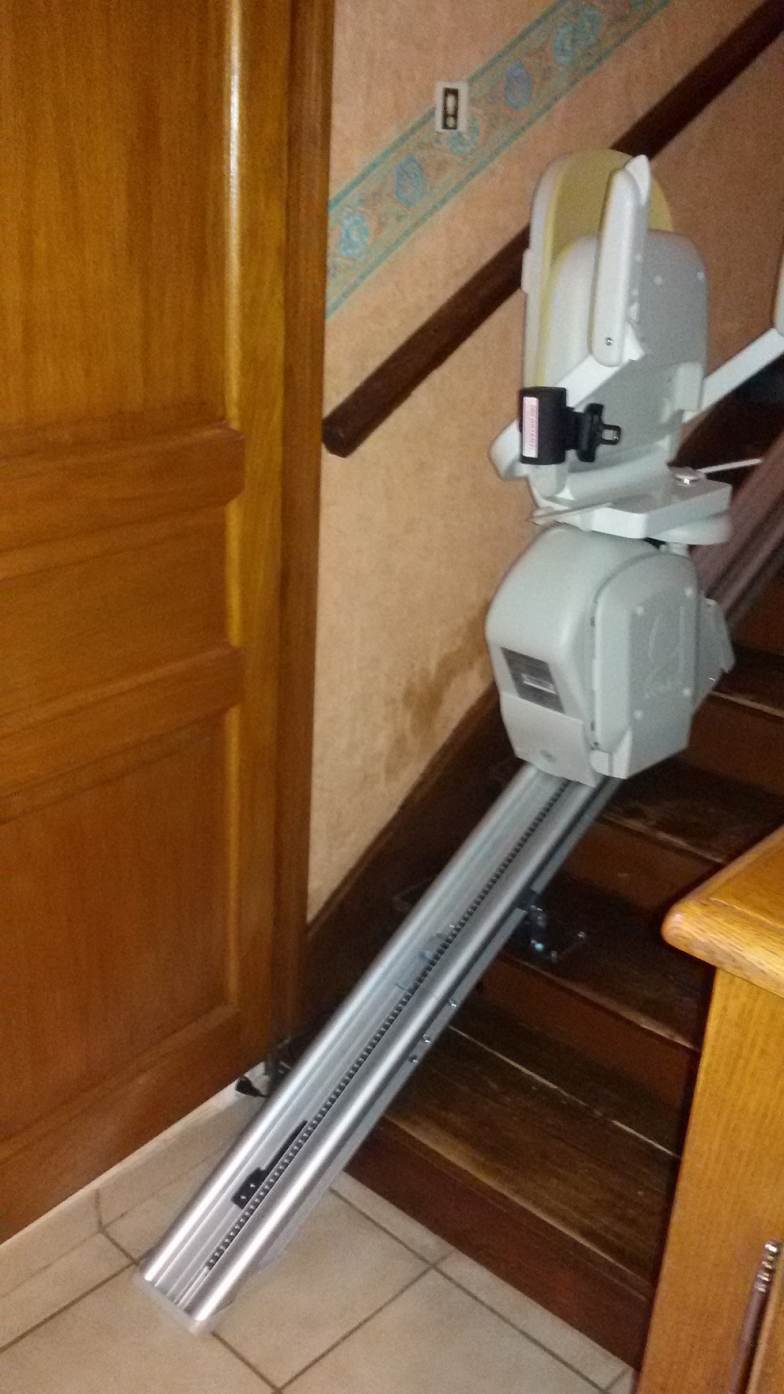 HANDIACCES vous propose un monte-escalier droit avec rail relevable en bas pour dégager le passage d'une porte ou d'un couloir situé à proximité de l'appareil.